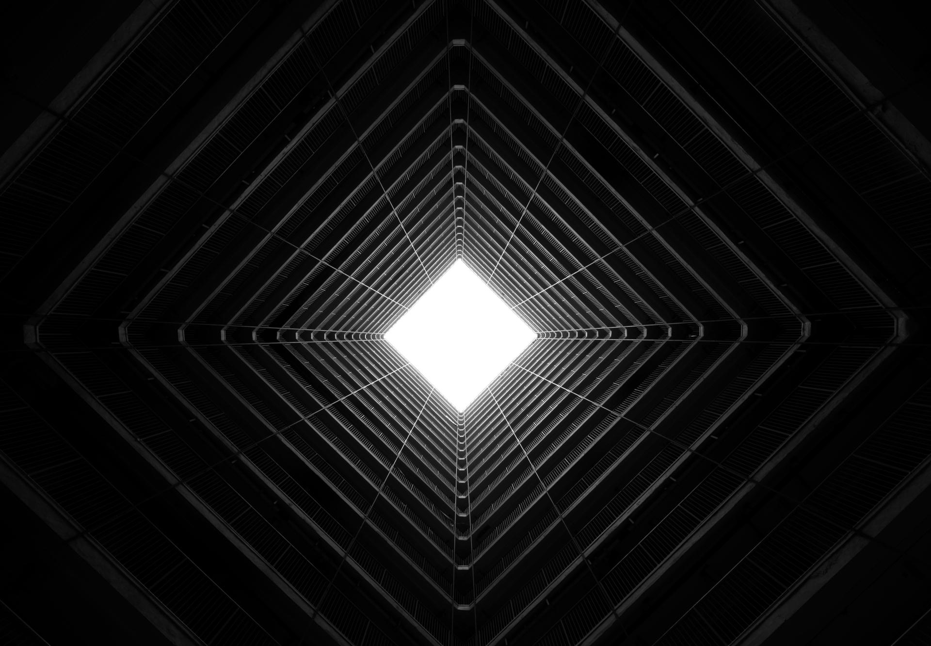 Taken in Oi Man Estate in Hong Kong, the idea is to reimagine this urban scene into a composition where the upward geometry converges and dissolves into light through a diamond-shaped aperture.