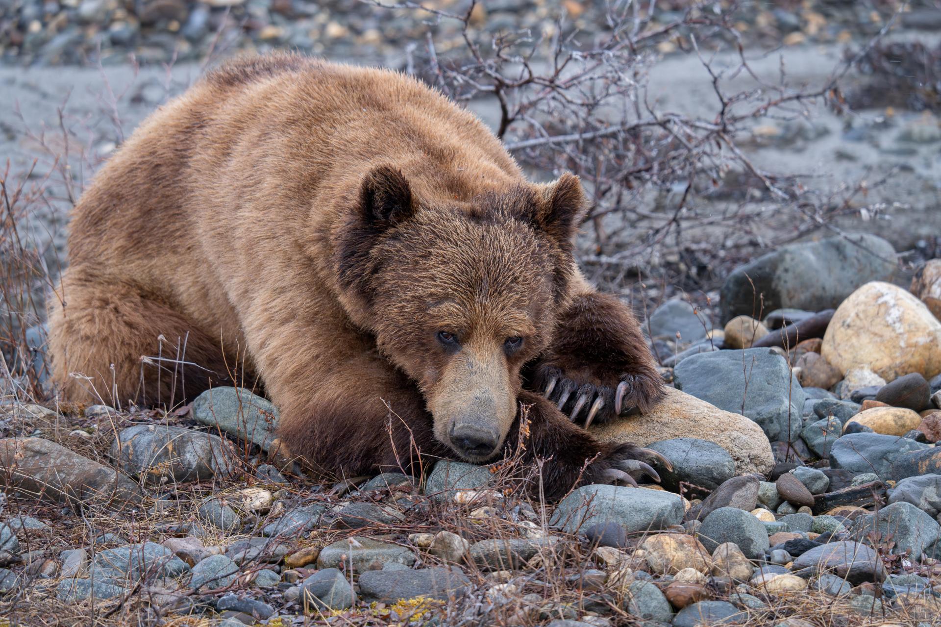 This photograph shows a powerful male grizzly bear in the Yukon, photographed in the wild and with deep respect for the animals. The image conveys the raw strength and presence of the bear while highlighting the fragile balance between human observation and wildlife in its natural habitat. The grizzly never took his eyes off me, and so I was under his supervision.