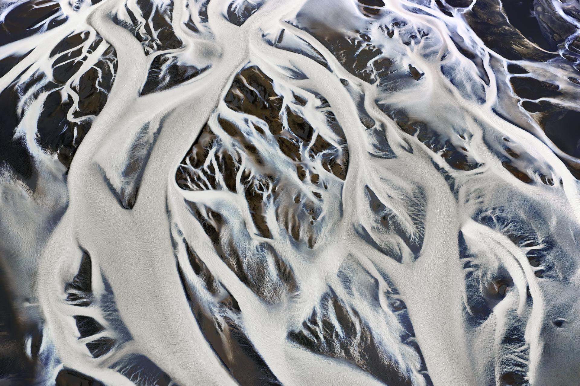 An abstract aerial photo of a beautiful braided river in the central highlands of Iceland.