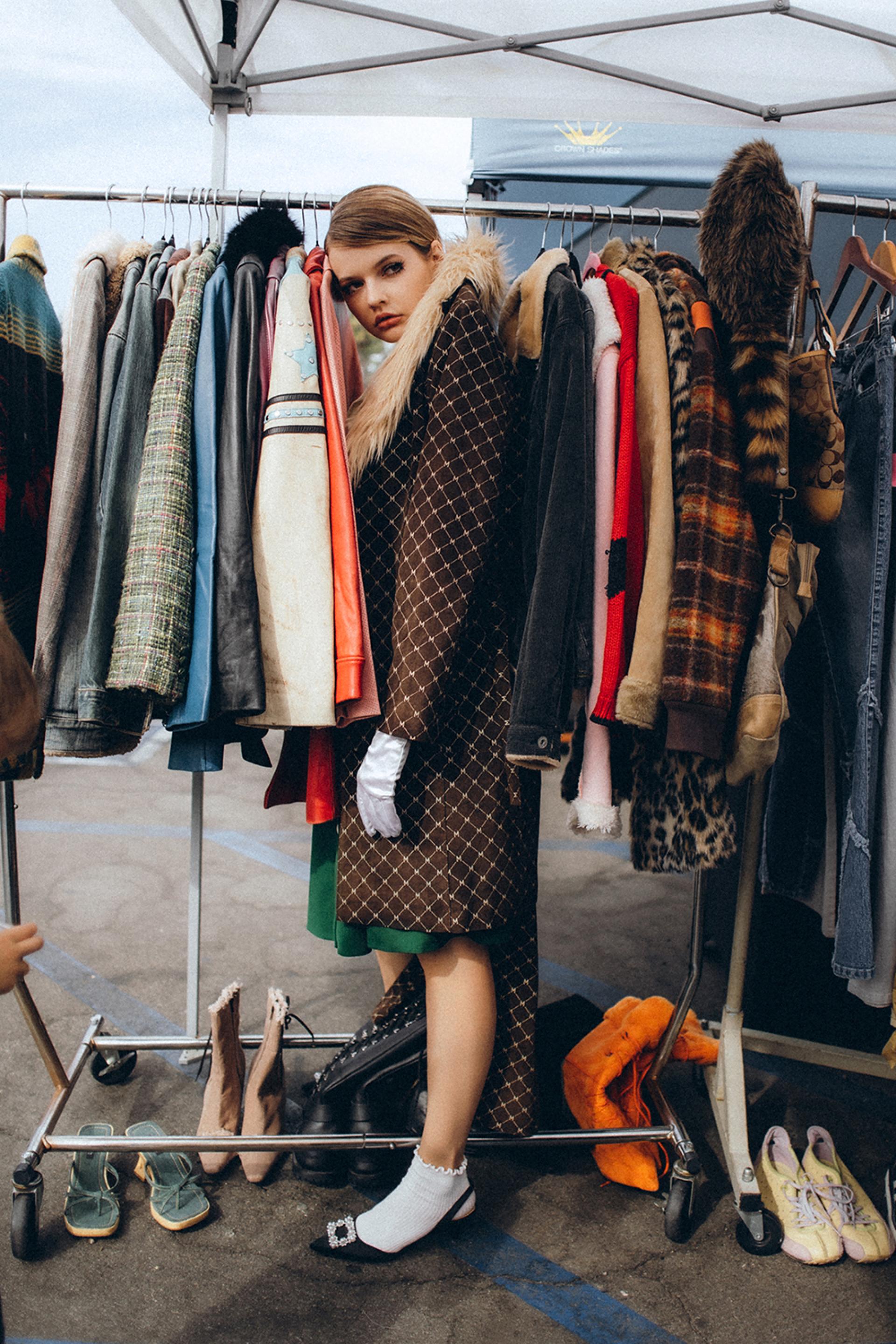 This image imagines Twiggy arriving in our modern world, still longing for the era she came from. She wanders through a flea market, searching for pieces that could bring her past back to life. The concept explores how strongly we hold onto what feels familiar, and how rarely we embrace the new. It blends retro nostalgia with a contemporary setting, creating a cinematic moment of contrast, identity, and timeless style